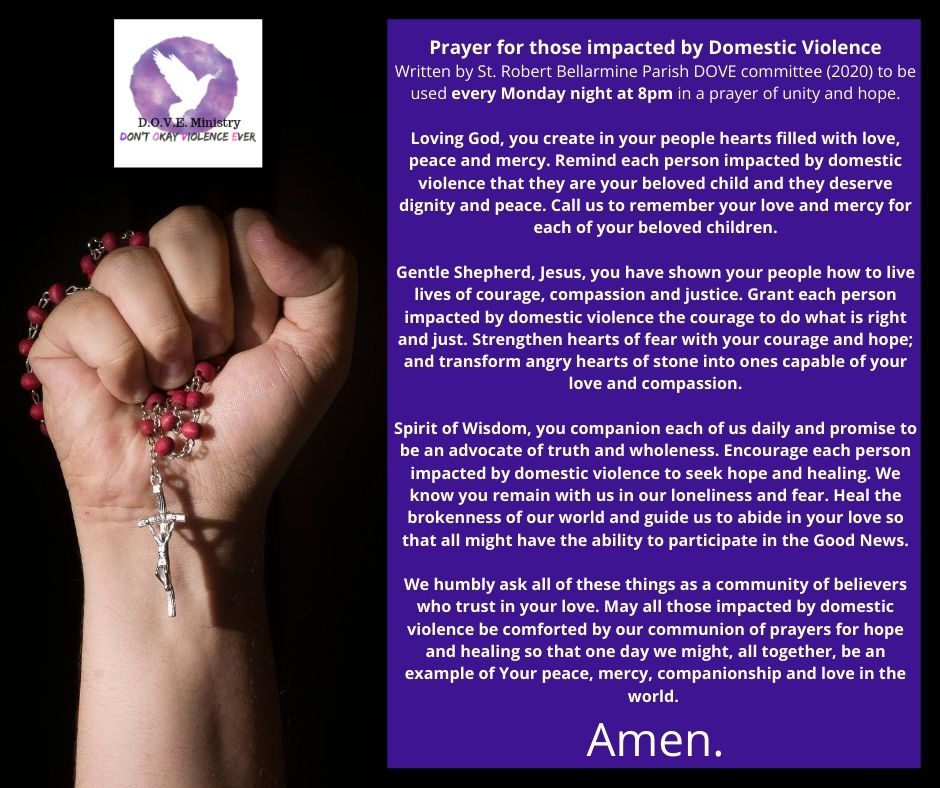 Our parish is proud to host a domestic violence outreach ministry, DOVE, which stands for Don’t Okay Violence Ever. Our mission is to raise awareness of domestic violence, to help victims and perpetrators connect to support services, and to promote the prevention of domestic violence. All are welcome to join the ministry! We meet every second Monday of the month via Zoom. For link or more information, email DoveMinistry.SRB@gmail.com.